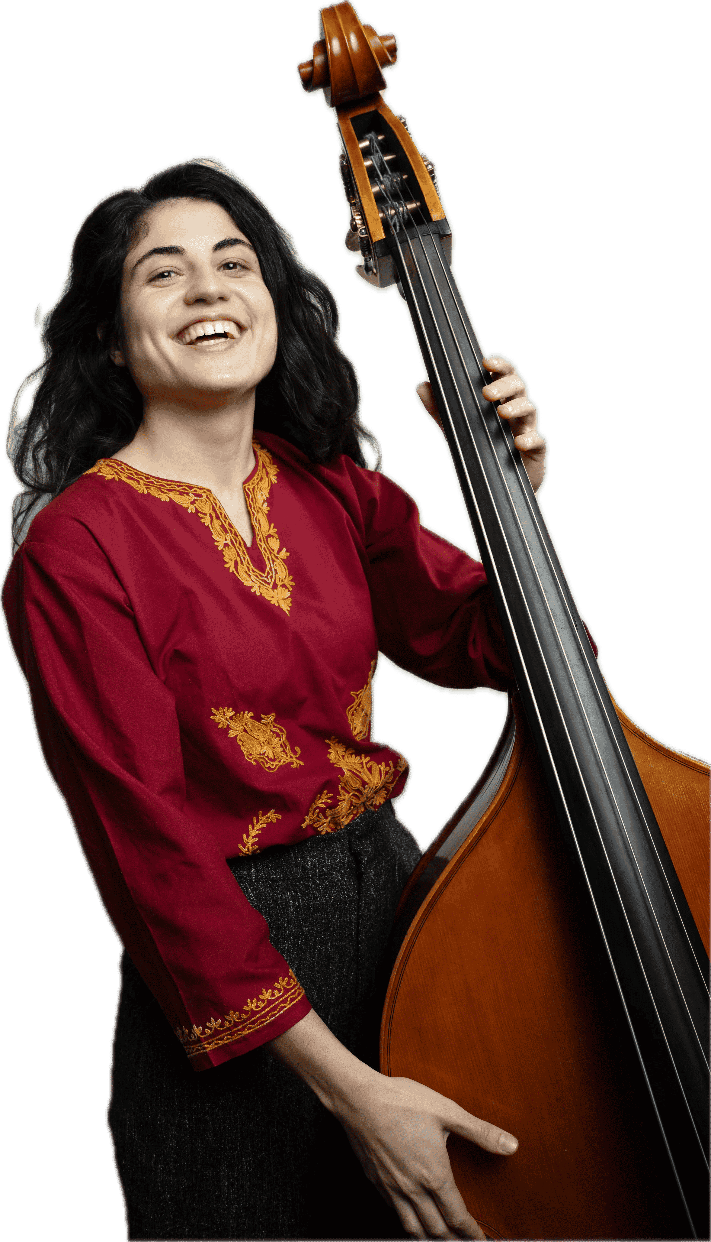Jenny Pillet is a double bass player, multi-instrumentalist, composer, and multidisciplinary artist, currently performing with Jaqamaz. Initially self-taught, she later deepened her musical practice with Romani and Manouche musicians such as members of the Loeffler family in Strasbourg, while also working with Papyros’n, a group exploring other folk traditions. She then continued her learning with Roma musicians across Eastern Europe, and her travels led to a deep interest in traditional music and dances. After several years on the road, Jenny settled in Brussels to study with Tcha Limberger, whom she had met by chance in Budapest. She entered the Royal Conservatory of Brussels, first in double bass and later in composition under Michelino Bisceglia. Jenny has performed with numerous traditional music ensembles across Europe and has taken part in several experimental and collective projects including Honky Tonk, a sailing tour between the Azores and Brittany. Her path between traditional music and contemporary creation naturally led her to join the prestigious Orchestre National de Jazz de Paris des jeunes (ONJ) for the 2024–2025 season.